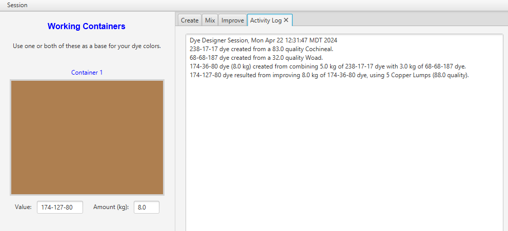 The Activity Log keeps track of the steps you make to create a color, in this example the creation of a copper color. Each time you update a working container, an entry is made to the log. You can then copy the log to your system clipboard and paste the entries into a text file using Notepad or another editor to help you re-create that color later on.