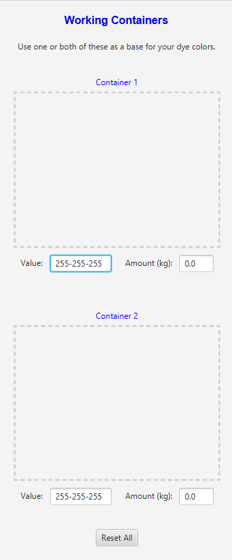 The working containers are used to hold your created and modified dyes. There are two available, so that you can test the result of mixing different dyes.