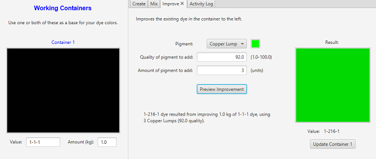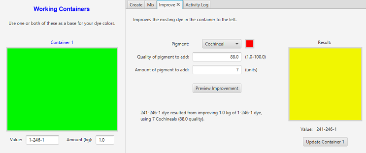 After updating a container, you can add additional, different pigments to achieve the color you want. In this case, we add cochineals to the green to produce yellow: