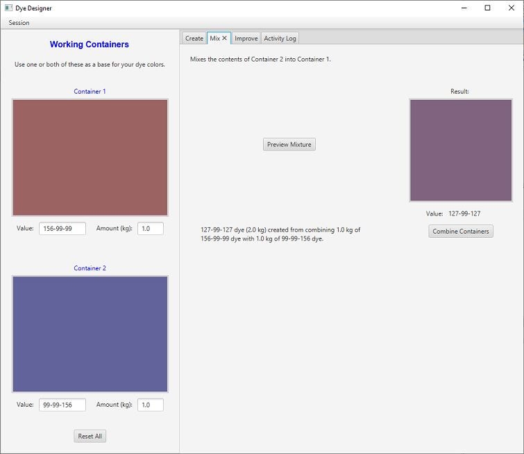 The Mix Tab combines the contents of the two working containers to show you the resulting color. This can be very useful what you need to combine existing reserves of dye to create a new color. You can vary the proportions of the two containers by changing the Amount of one or both containers to see the result.