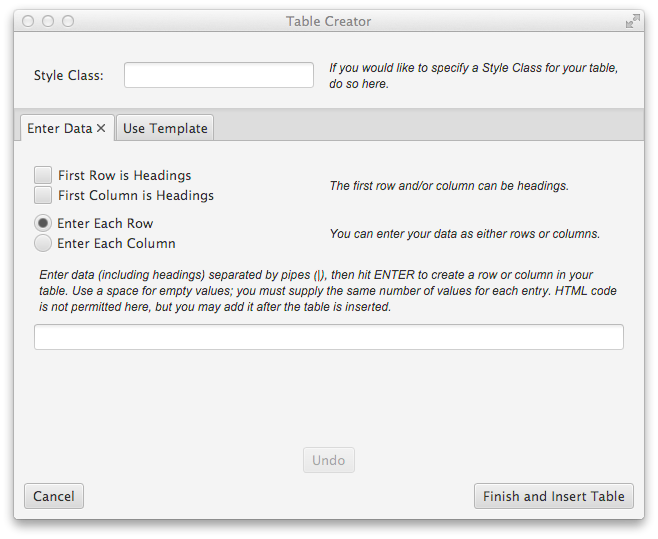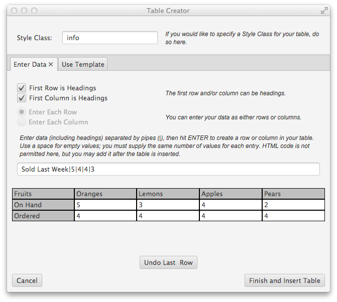 This option lets you quickly enter a table of text values. Each entry is separated by the pipe (|) character; once you press the ENTER key, that row (or column) is added to the table.
