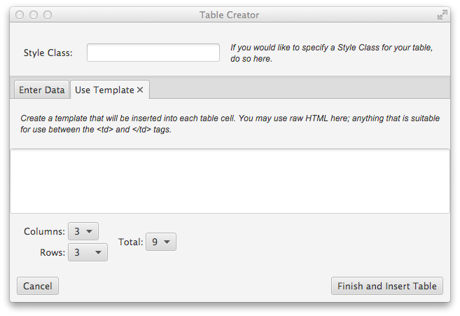 This function lets you define a template to populate each cell of the table you enter. Templates come in handy if you want to create a table that contains similar html code in each cell.