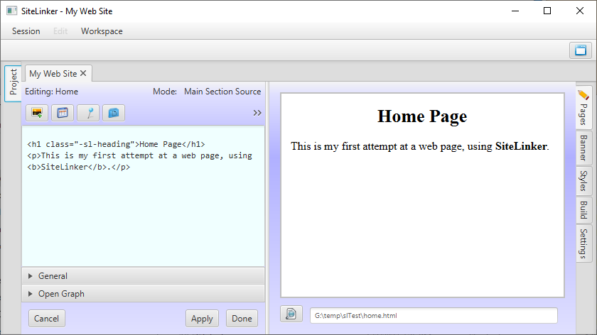 Unlike a What-You-See-Is-What-You-Get (WYSIWYG) tool, in SiteLinker you directly edit the HTML source and once you "Apply" the changes, you see the results in the preview window. This has both benefits and drawbacks, depending on how you prefer to write your web pages.