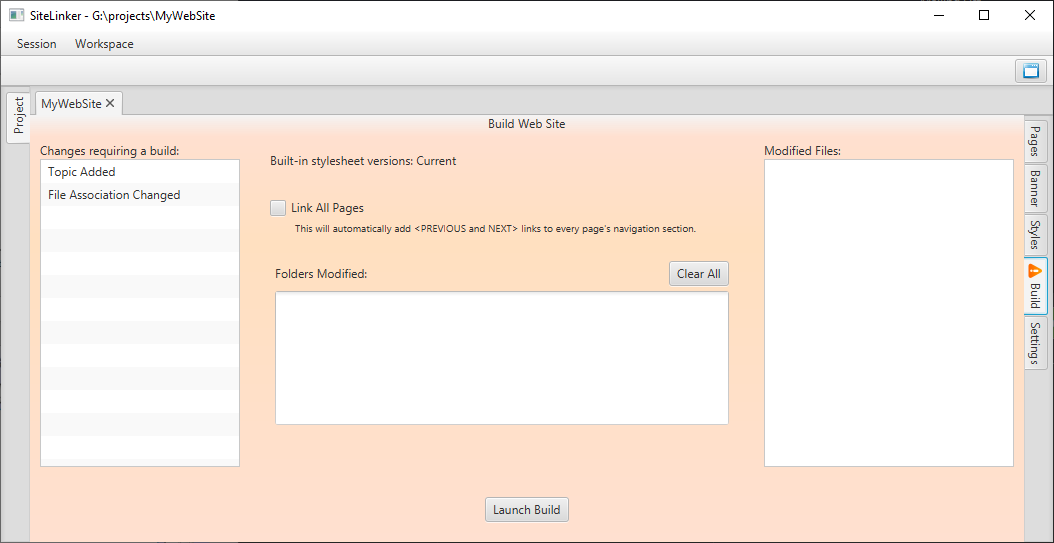 When you click the Launch Build button, a list of folders and files that have been modified by the build process will be displayed. The Changes requiring a build: and the build alert icon will disappear when the process completes.