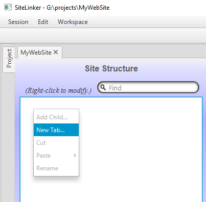 When you first create a project, the Site Structure section will be empty. At this point, you can only add a new tab. Do this by right-clicking anywhere in that empty space. You can then select the tab name to add; in this case, we will use "Home".
