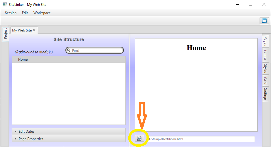 After creating the build, your web site (such as it is) is ready to view and deploy to your server. Select the Pages tab, then click on the icon at the bottom of the preview page to see how it all looks in your web browser.