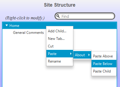Here we are pasting the About topic previously removed by the Cut operation as another tab (in this case, as it was before), after Home. We could have also pasted it as the first tab by using the Paste Above option, or as a normal child (not a tab) beneath the Home tab.