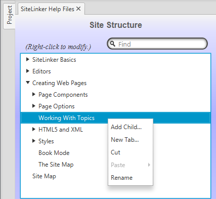 To modify the site structure, you will usually right-click in this area and select an option from the context menu. The functions available from this menu are:
