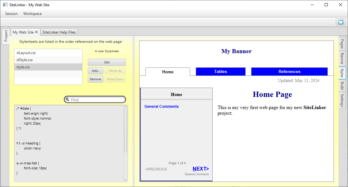 Stylesheets are used to give your web site a consistent look. The Style tab lists all stylesheets in use, and clicking on each one will display its contents. Every stylesheet configured will be available to all of the web pages in your project.