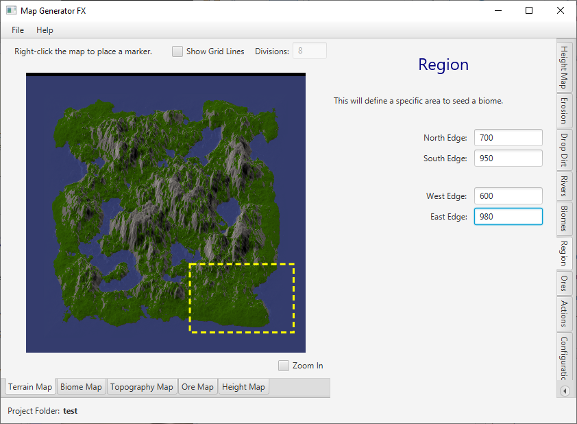 Adds a Region feature, which allows you to specify an area of the map when generating biome seeds. Thus, you can randomly generate trees, flowers, resources, etc without explicitly painting them, but restrict them to a given area.