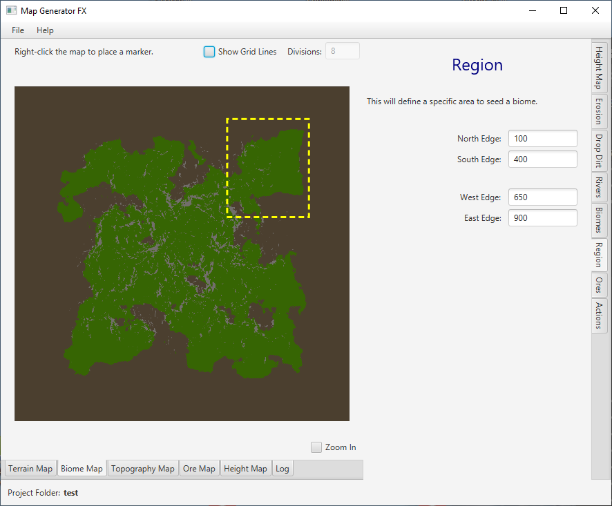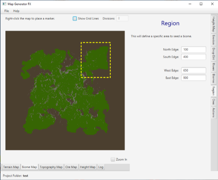 The border is updated whenever you leave a field you just changed, or when you press the ENTER key. When a region is set, the border is displayed on the Terrain, Biome, and Topography maps, and any biome you create will be restricted to that area, although some growth may cross the border if it's large enough.