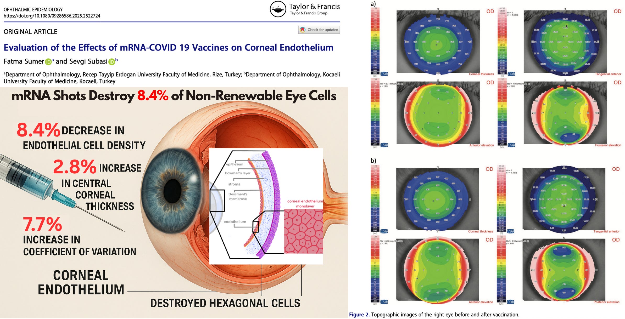 A study published in Ophthalmic Epidemiology finds a dramatic decrease in the layer of corneal endothelial cells subsequent to mRNA-COVID 19 'vaccination'. These cells, thought to never regenerate once formed, are responsible for maintaining corneal transparency and hydration.
