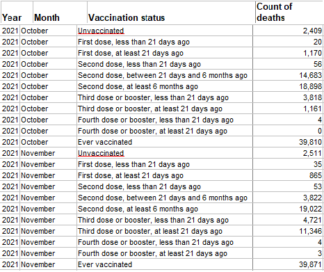 UK ONS Data: Monthly data of deaths in England, broken down by vaccine status.