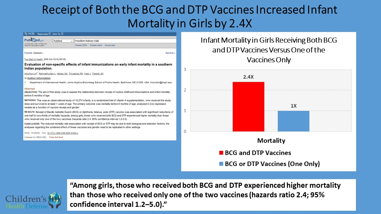 Findings: Increase in mortality for girls receiving both the BCG (tuberculosis) and DPT vaccines.