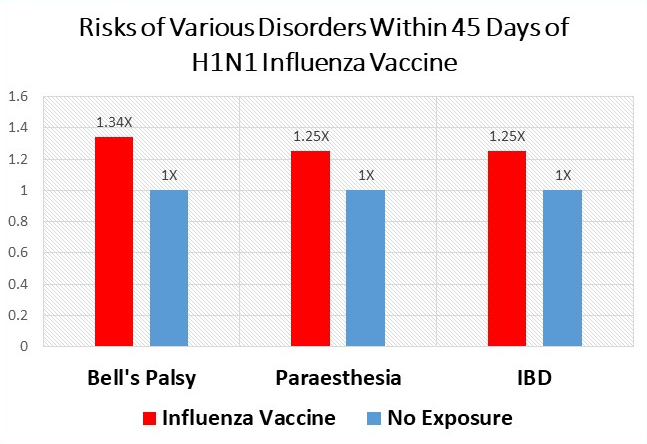 Pandemic Influenza A (H1N1) inoculation is associated with an increased risk of Bell's Palsy, Paresthesia, and Inflammatory Bowel Disease (IBD).