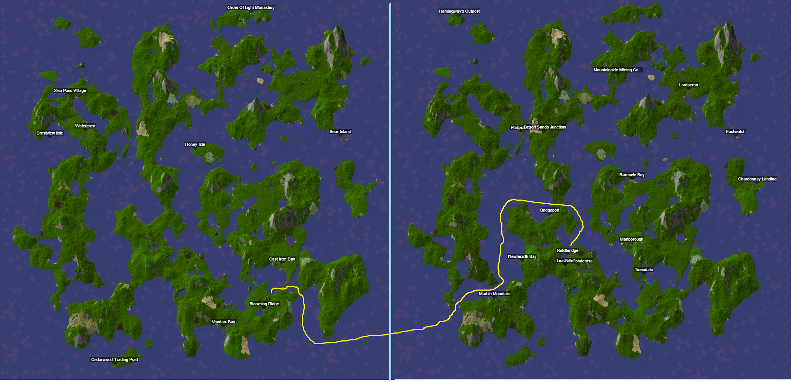 For example, if you wanted to travel from the Cedarwood Trading Post in southwest Watercrest to Hemingway's Outpost in Northwest Riddleridge, it would take a very long time to sail west and cross the entire Riddleridge server, then turn north and sail once more across the entire expanse of Riddleridge. Instead, you can make the trip in a fraction of the time by plotting a course (See: Travel Between Servers) to Riddleridge and sailing south.