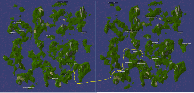 In other wind conditions, the South to Riddleridge or North to Watercrest route is usually better for these destinations. However, with the new Cast Iron Bay canal, it may be more feasible to travel to Cast Iron Bay or Blooming Ridge from the towns of Riddleridge or Bridgeport via the Wolf's Head Passage tunnel in western Riddleridge.