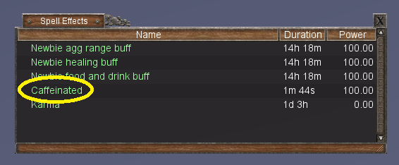 You can see how much time is left on your caffeine bonus by displaying the Spell Effects window from the Hud Settings menu. The effect is paused while your character is logged off.